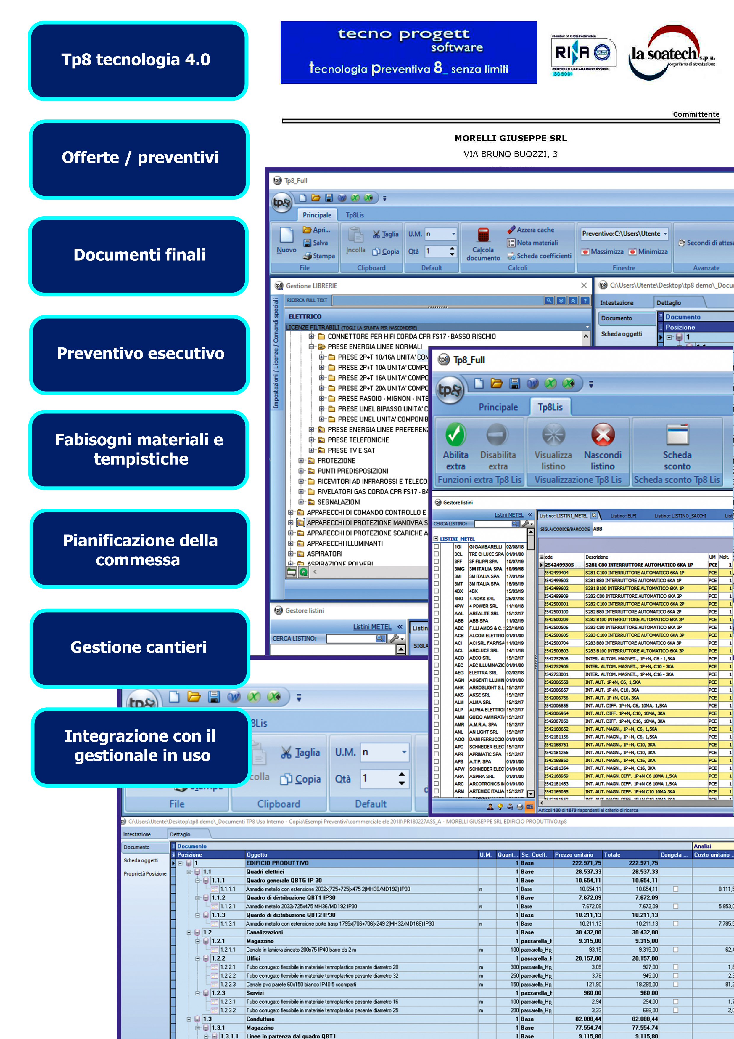 Tp8 è il software che permette di elaborare l’offerta dettagliata per ottimizzare tutta la filiera dalla preventivazione alla gestione della commessa, del cantiere e delle consuntivazioni.